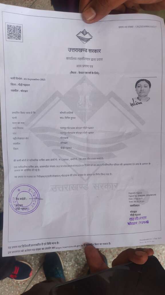विधवा पेंशन पर आश्रित महिला का कोटद्वार तहसील कर्मियों ने आय प्रमाण पत्र में दर्शा दी 10 हजार रुपये की धनराशि