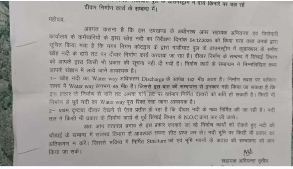 खोह नदी के किनारे नगर निगम की ओर से बनाई जा रही सुरक्षा दीवार अब खुद सवालों के घेरे में है .. सिंचाई विभाग ने चेतावनी दी है कि यह दीवार सुरक्षा से ज़्यादा बाढ़ का संकट बन सकती है।विभाग का कहना है कि दीवार बनने से खोह नदी संकरी हो जाएगी और बरसात के मौसम में उफनती नदी का रुख दूसरी ओर बसी घनी आबादी की तरफ हो सकता है।इसी खतरे को देखते हुए सिंचाई विभाग ने नगर निगम और जिला प्रशासन को पत्र लिखकर आगाह किया है।